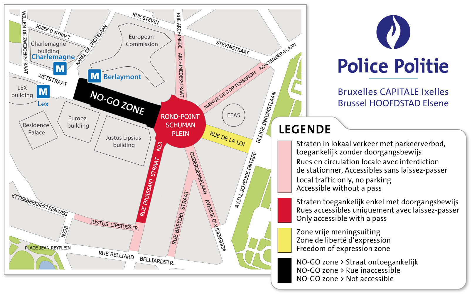 - La rue de la Loi entre l’avenue de la Joyeuse Entrée et le rond-point Schuman, également appelé “la zone liberté d’expression”.